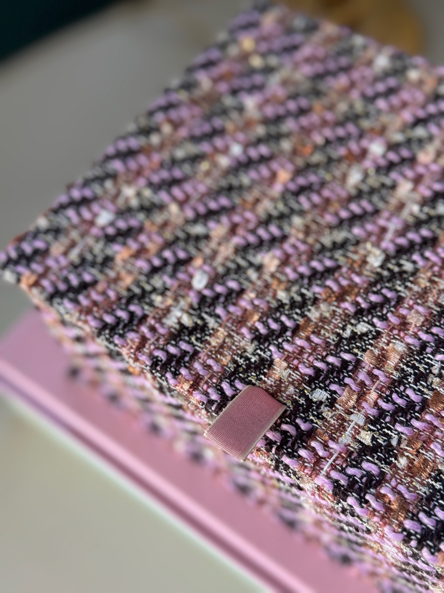Cet exemplaire unique est réalisé dans un Tweed raffiné, aux rubans entrelacés de fils dorés.