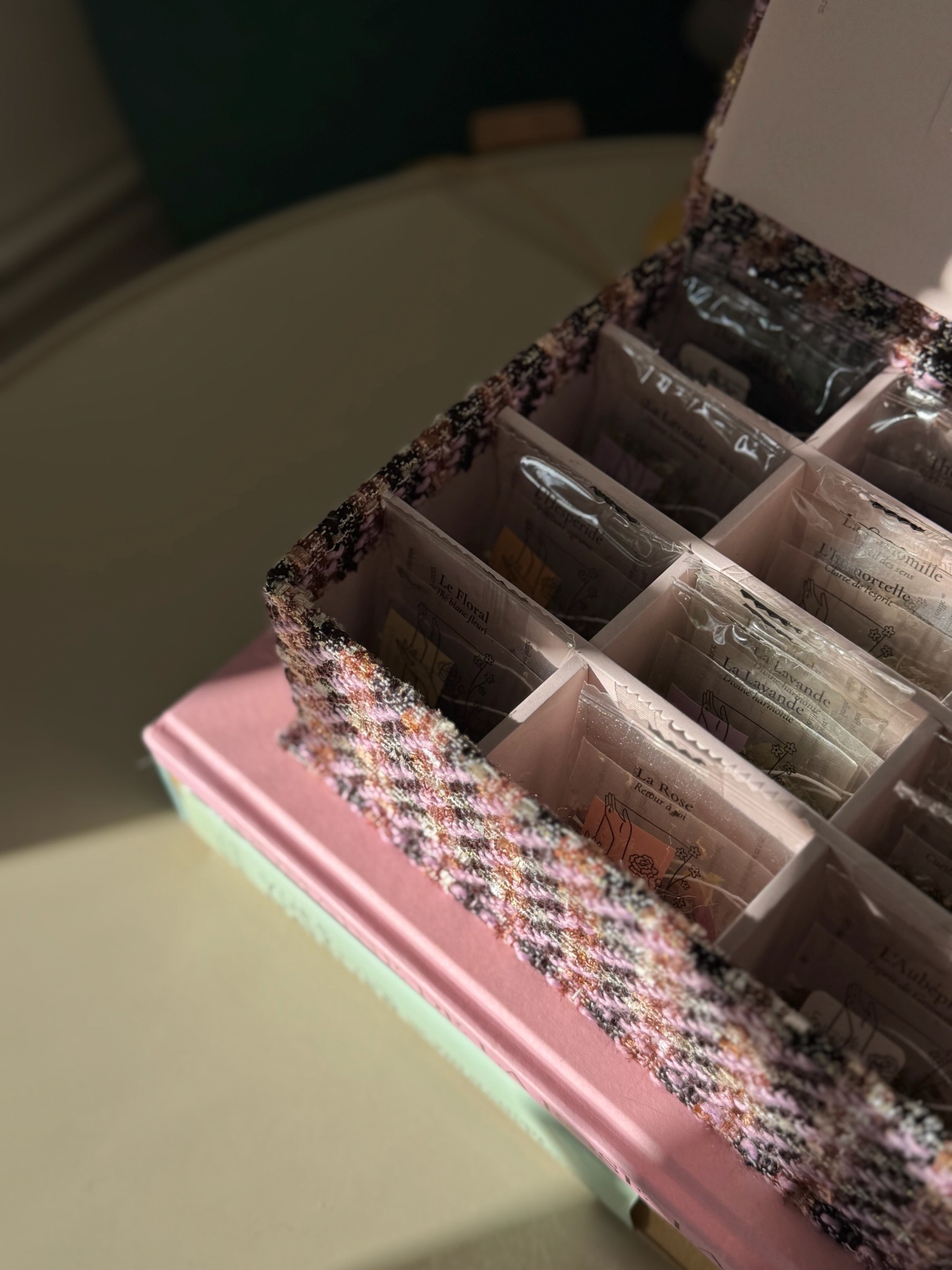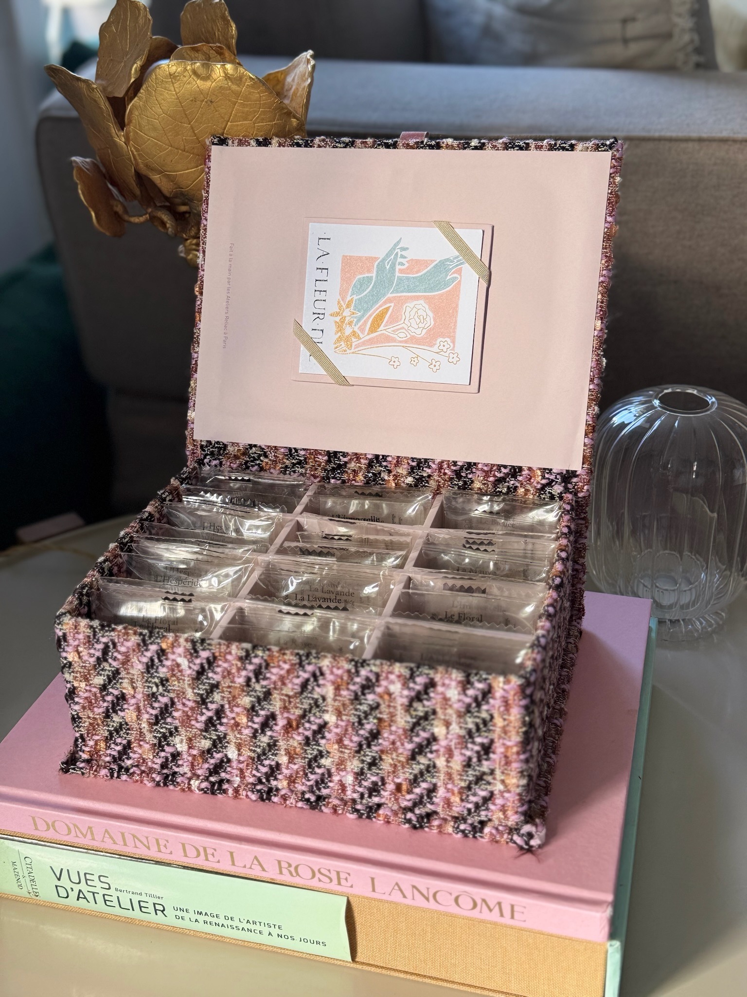 Dans le secret feutré d’un chez-soi nos coffrets à thé ouvrent un écrin de délicatesse où chaque sachet révèle l’histoire d’une fleur.