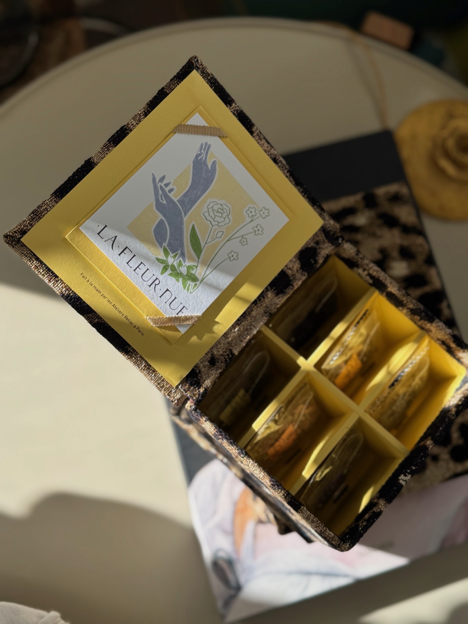Dans le secret feutré d’un chez-soi nos coffrets à thé ouvrent un écrin de délicatesse où chaque sachet révèle l’histoire d’une fleur.