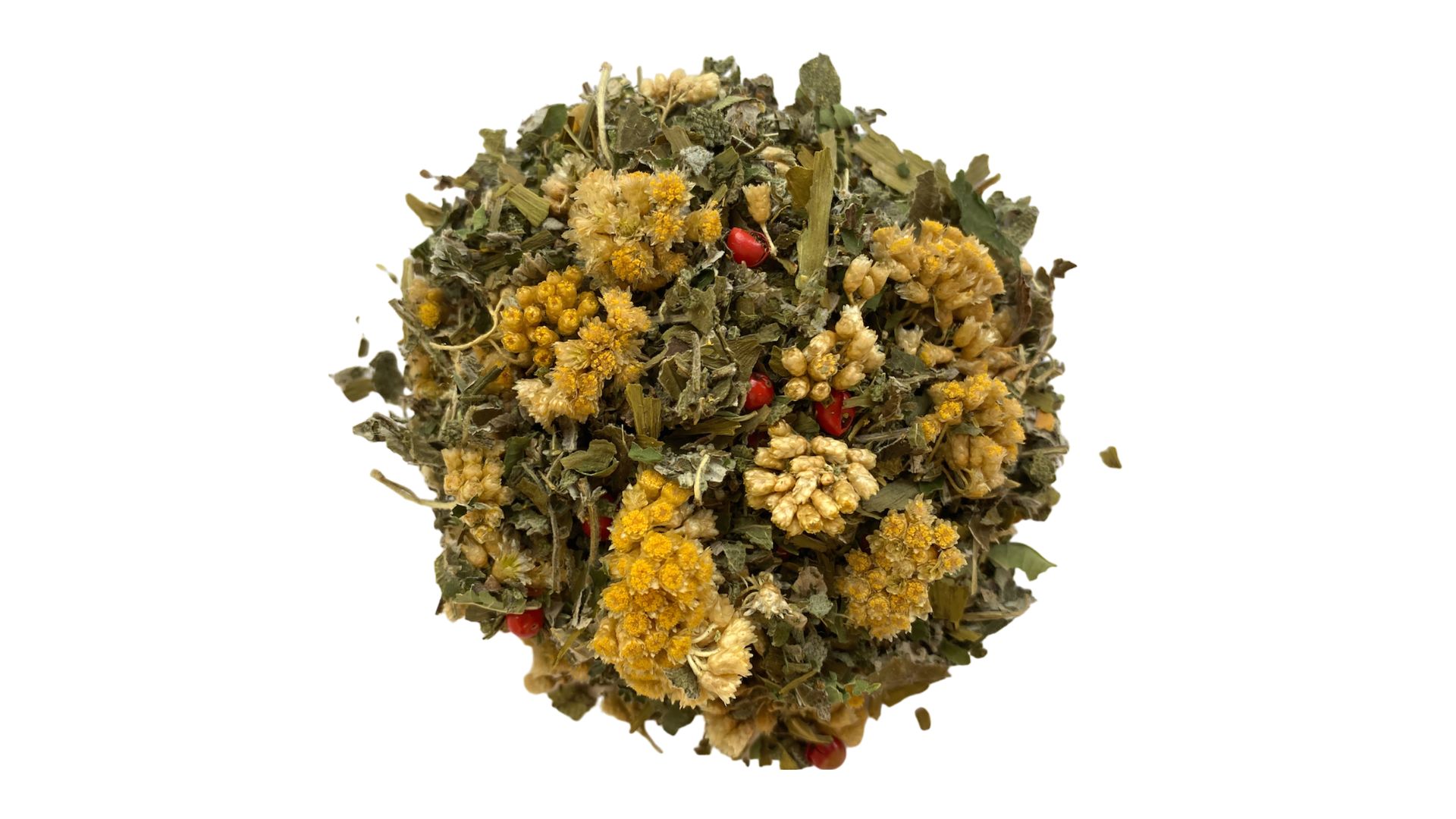 Gingko feuille, Immortelle fleur, Sauge feuille, Framboisier feuille, Baie rose, Verveine odorante feuille.